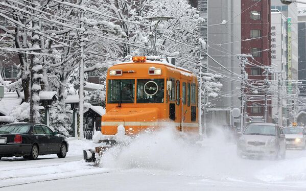 Снегоуборочный вагон на улицах Саппоро в Японии.