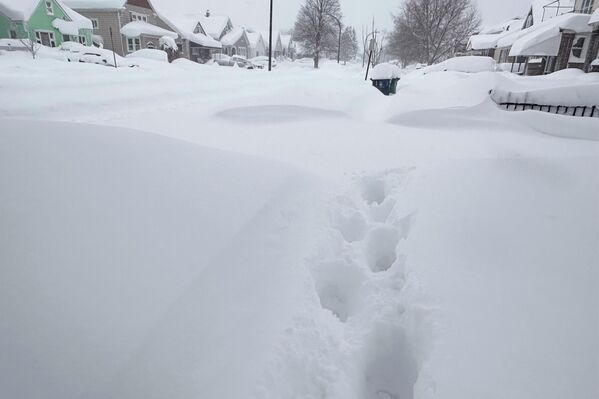 На жилой улице видны следы ног после того, как за ночь выпало не менее 45 сантиметров свежего снега – в дополнение к 90 сантиметрам, которые выпали в выходные в Буффало, штат Нью-Йорк.