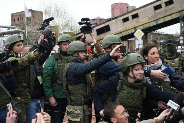 Žurnālisti kalnu un šahtu iekārtu remonta rūpnīcā "Specugļemaš", kas cietusi Ukrainas armijas apšaudes rezultātā