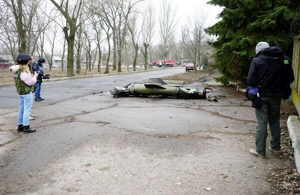 Korespondenti pie Ukrainas raķetes "Tochka U" atliekām. Ukrainas armija to palaida pret naftas bāzi Doņeckas Kirovas rajonā, taču pretgaisa aizsardzība šāviņu pārtvēra