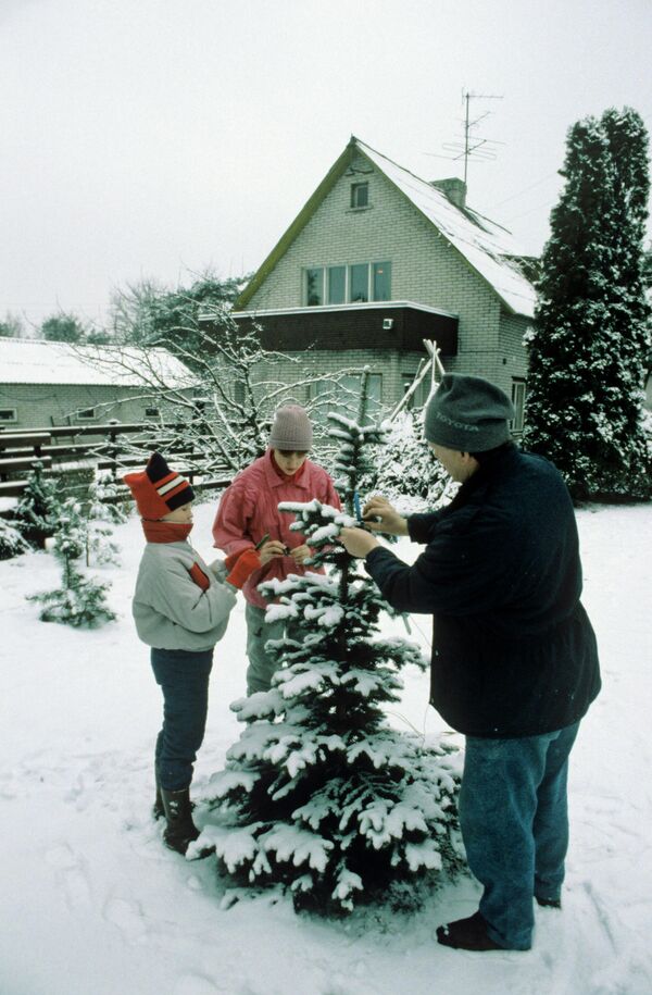 Лютеранское Рождество в Эстонии. Семья наряжает рождественскую елку во дворе своего дома, 1990 год.