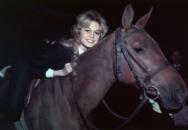 Брижит Бардо со своей любимой лошадью тренируется в школе верховой езды в Париже для съемок в Испании, 1958 год.
