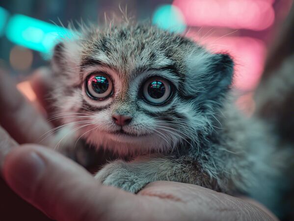 Внешность и особенности: умещается на ладони, но сохраняет пропорции взрослой кошки. Огромные глаза занимают 30% мордочки, ночное зрение как у совы. Двойной подшёрсток как у манула + самоочищающиеся нановолокна.