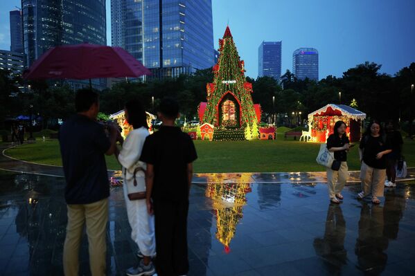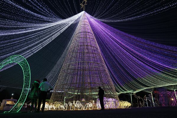 Люди проходят мимо рождественской елки, установленной в парке в Джакарте, Индонезия.