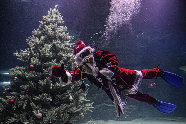 1/19© Sputnik / Alexey Maishev / Дайвер в костюме Деда Мороза погрузился в главный морской аквариум «Москвариума» на ВДНХ для поздравления посетителей с наступающим Новом годом.© AP Photo / Ohad Zwigenberg