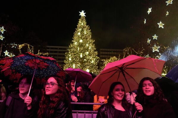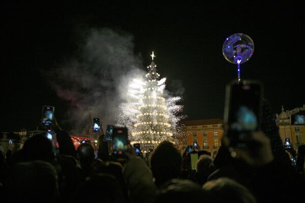 Зажжение огней на рождественской елке в Лиссабоне, Португалия.