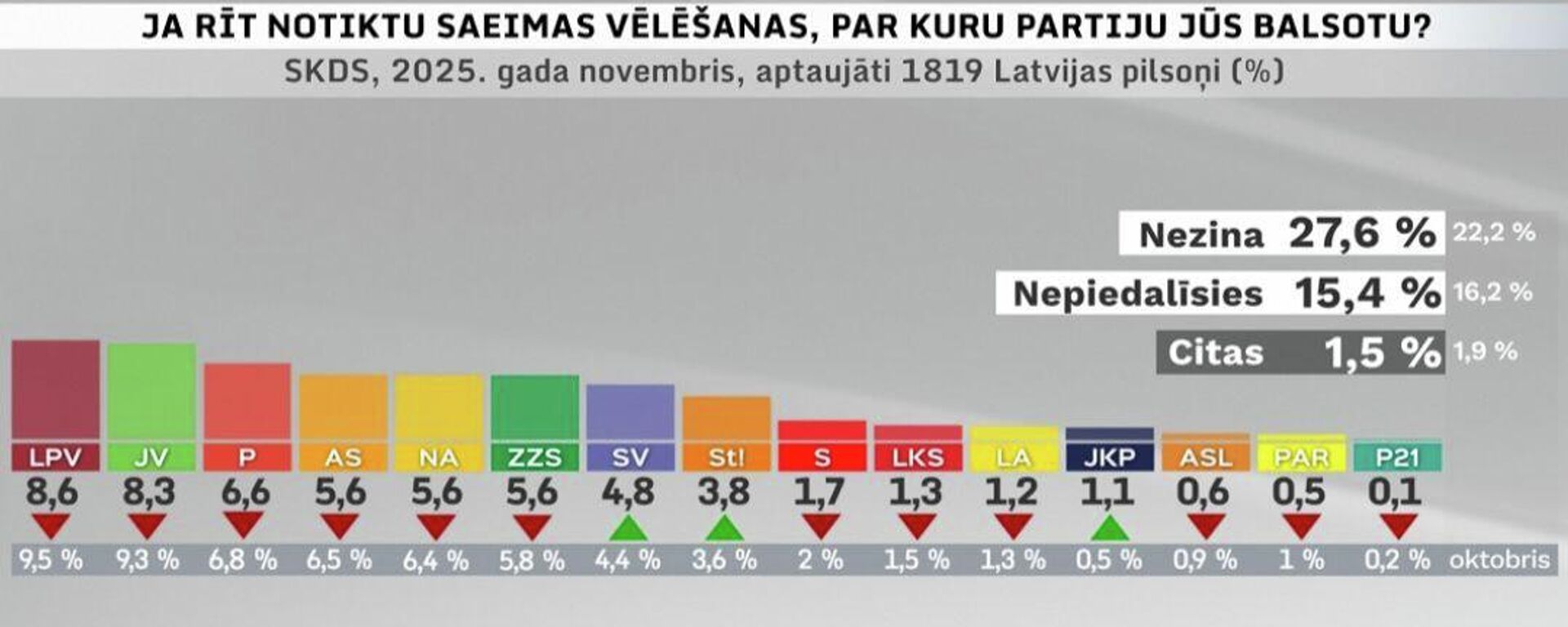 Рейтинг партий Латвии в ноябре12 декабря 2025, 14:30До выборов в Сейм 3 октября осталось менее года, поэтому новую партию, которая могла бы участвовать в выборах, учредить уже невозможно.
