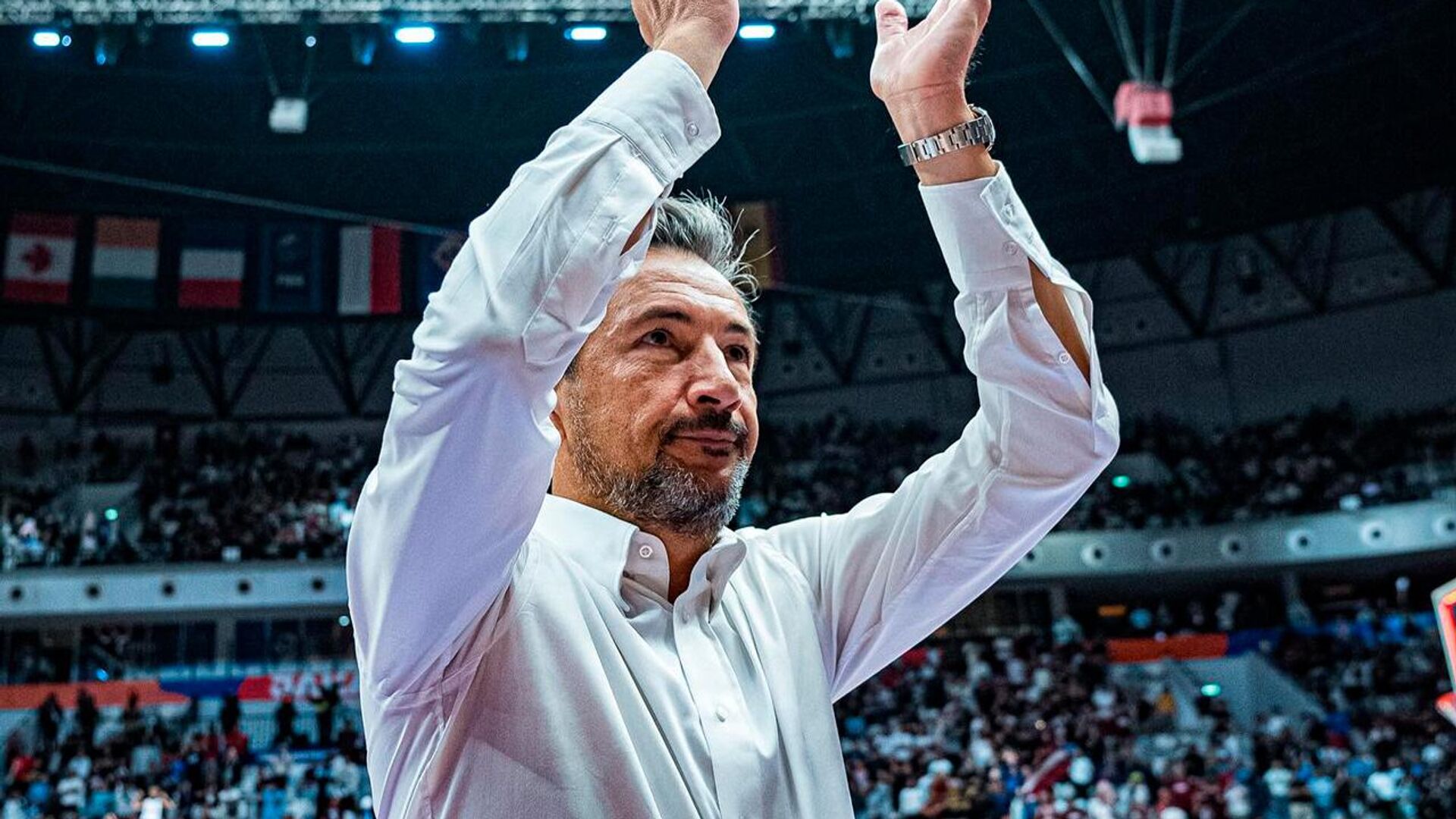 Главный тренер сборной Латвии Лука Банки благодарит болельщиков после победы над сборной Франции на ЧМ-2023 в Джакарте