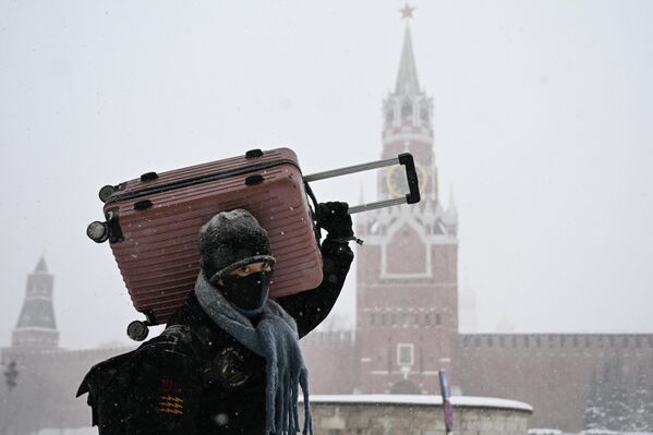 10/10© Sputnik / Pelagiya Tikhonova / Иностранный турист во время снегопада на Красной площади в Москве. В ночь на 9 января Москву и Подмосковье накрыл циклон «Фрэнсис». За ночь выпало две трети месячной нормы осадков.