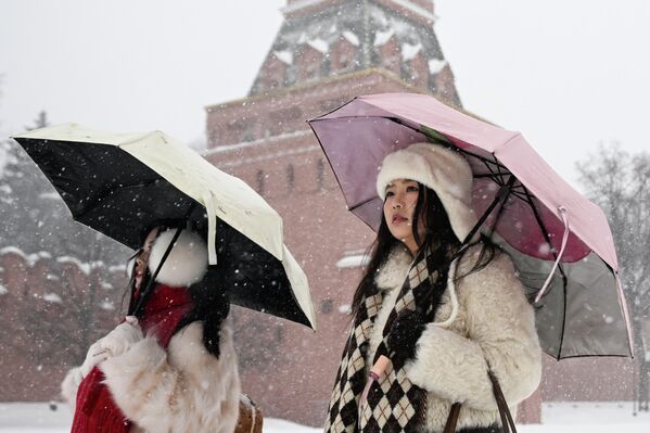 / Иностранные туристы во время снегопада на Красной площади в Москве. В ночь на 9 января Москву и Подмосковье накрыл циклон «Фрэнсис». За ночь выпало две трети месячной нормы осадков.