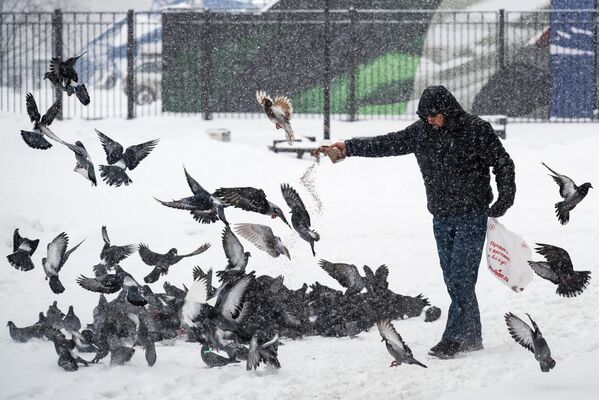 2/10© Sputnik / Kirill Zykov / Снег на улице в Москве.© Sputnik / Ilya Pitalev / Мужчина кормит голубей во время снегопада в Москве. В ночь на 9 января Москву и Подмосковье накрыл циклон «Фрэнсис». За ночь выпало две трети месячной нормы осадков.
