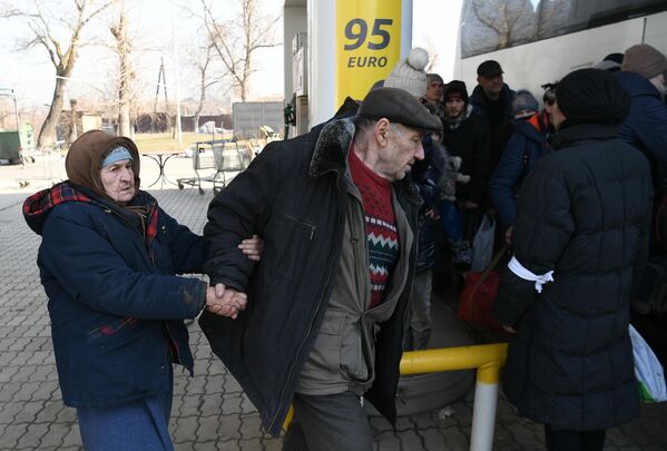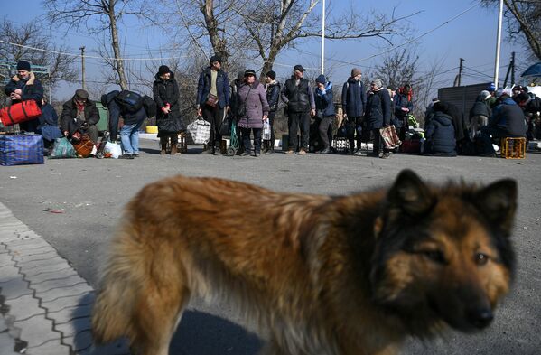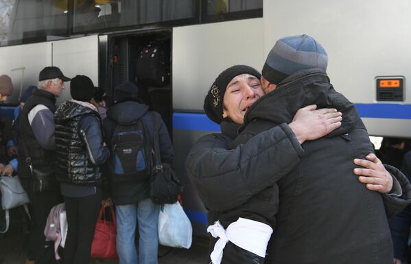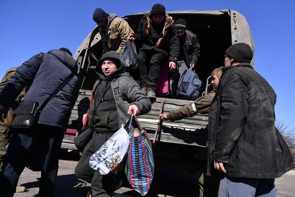 Mariupoles iedzīvotāji kāpj ārā no DTR karavīru mašīnas Sartana ciemā. Doņeckas karavīri izved bēgļus šurp, pēc tam viņi autobusos brauc uz pagaidu izmitināšanas punktu Novoazovas rajonā