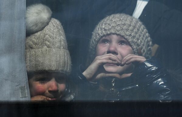 Bēgļi no Mariupoles sēžas autobusā, kurā dosies uz pagaidu izmitināšanas punktu Nikoļskoje ciemā