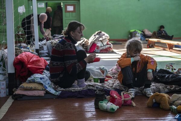 Sieviete ar bērnu bēgļu izmitināšanas centrā bērnu un jauniešu sporta skolas ēkā Starobeļskā